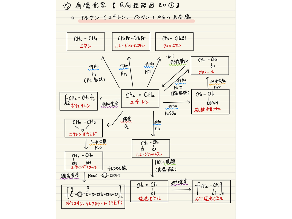 ここでは、エチレンを開始物質とした反応経路図をおさえておきましょう。
